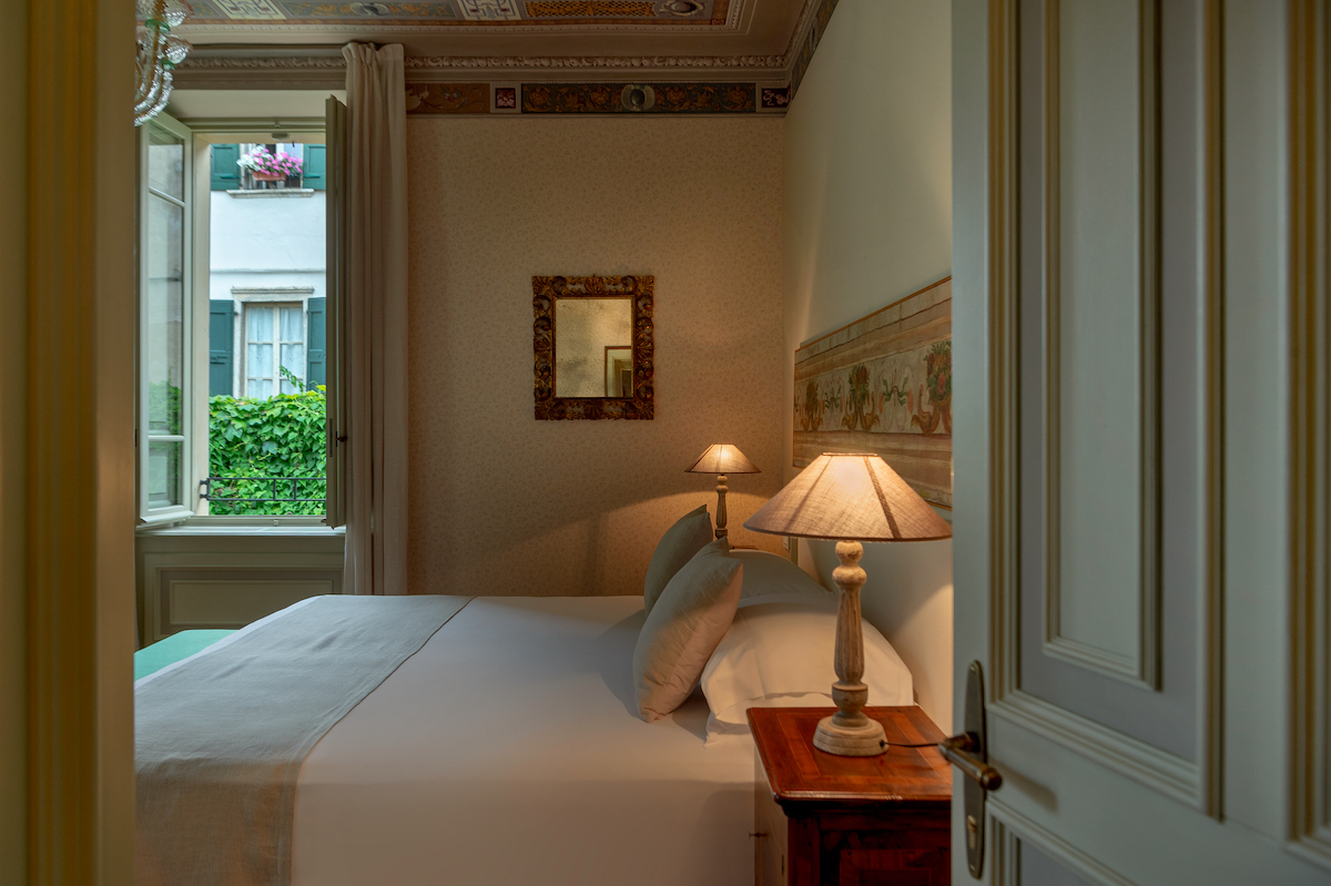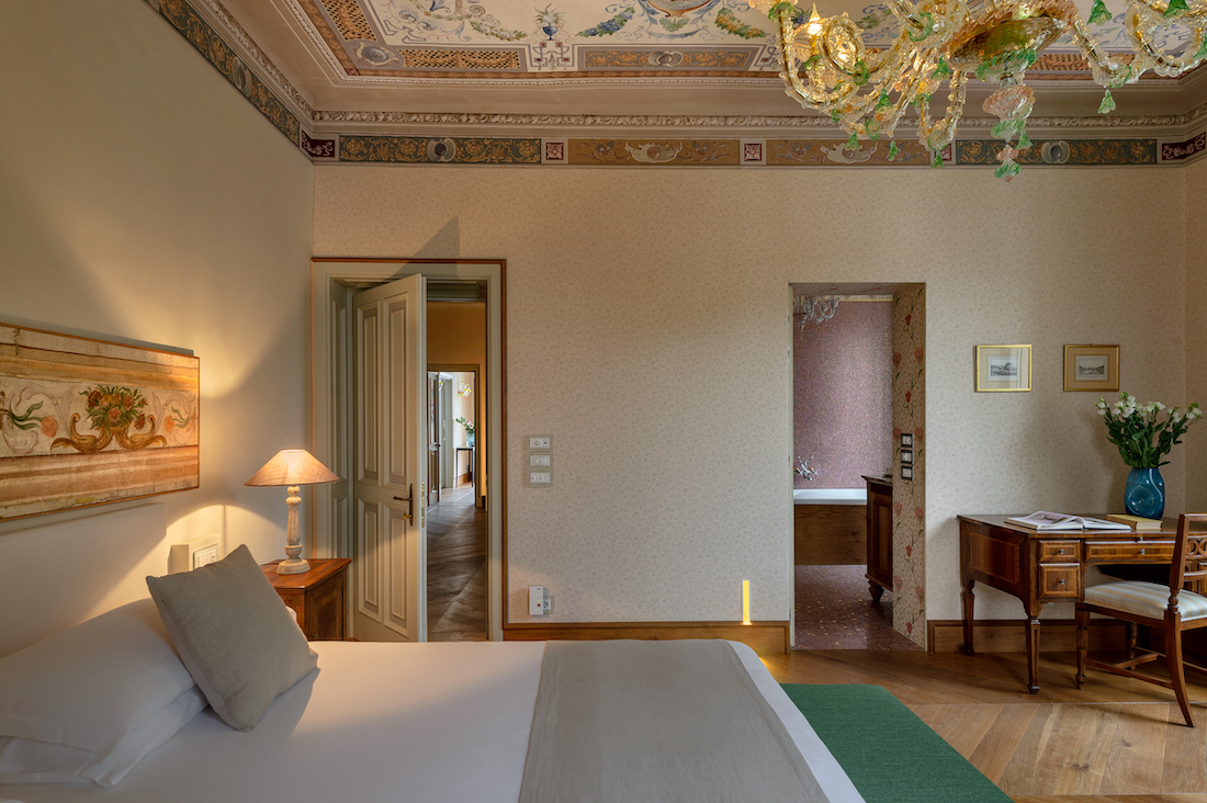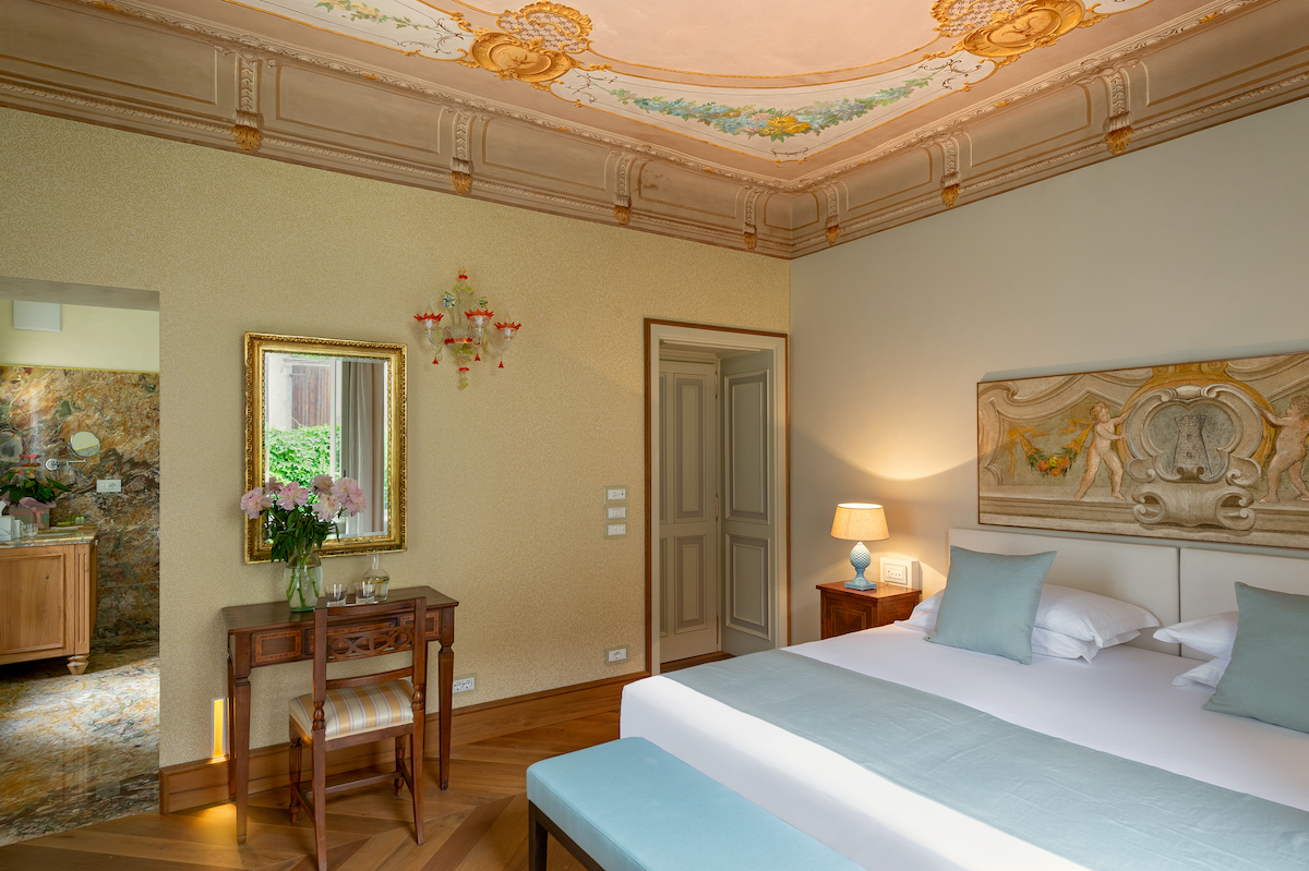 Our two delightful deluxe rooms are located on the first floor of Villa delle Palme. In the lovingly furnished rooms you will find an extra large double bed, a flat screen with satellite TV and a desk. The light-flooded rooms have high windows with a panoramic view of Lake Garda or the beautifully designed inner courtyard. With 26 m2 of space, you can relax and unwind.