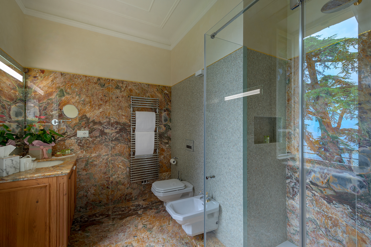 Each deluxe room has a private bathroom with modern shower and bidet – one of the two rooms also has a bathtub.