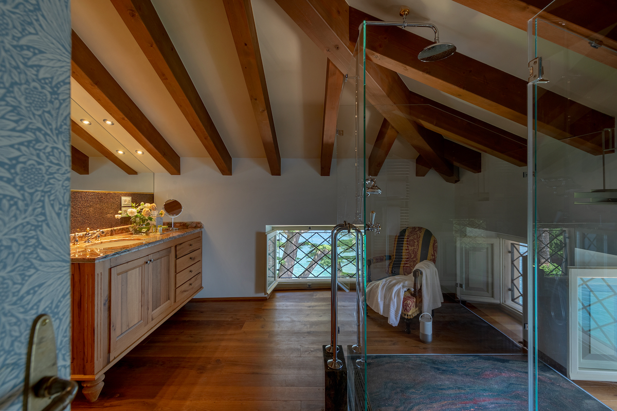 Adiacente alla camera da letto si trova il bagno privato con una doccia moderna nello stile di un cubo di vetro. Il bagno è inoltre dotato di bidet.